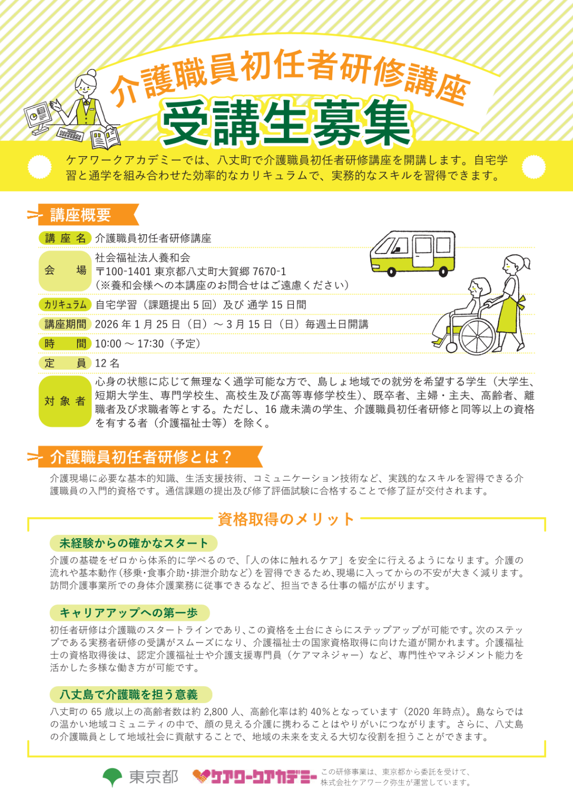 ケアワークアカデミーは東京都からの委託事業として、この度、八丈島にて介護職員初任者研修を開催することとなりました。
